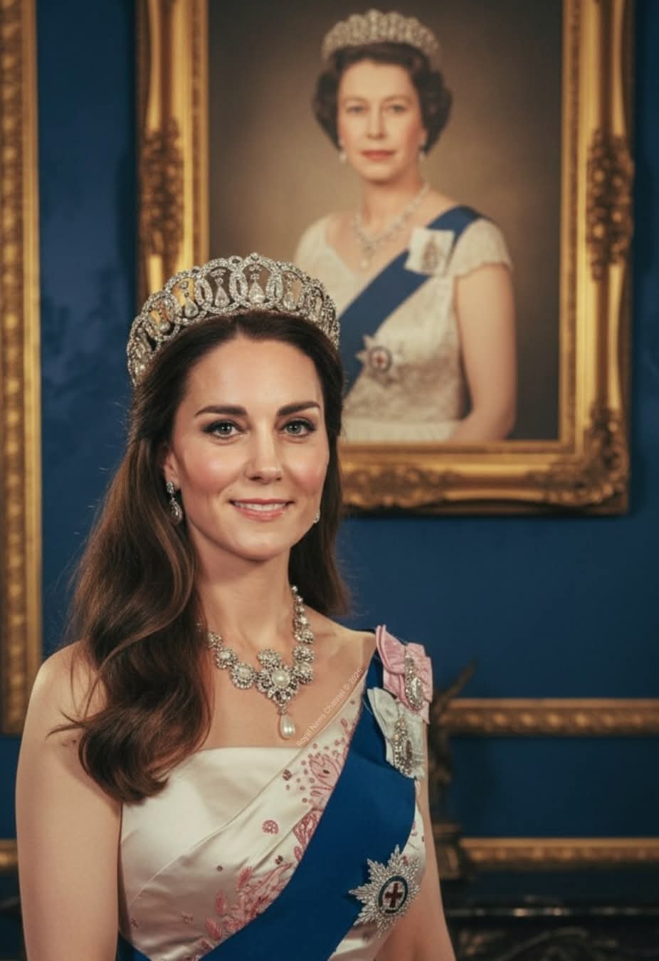 The scene is almost poetic: Catherine, radiant in a pale satin gown adorned with delicate pink embroidery, stands before a grand portrait of Queen Elizabeth II. The composition captures something rare — not imitation, but inheritance. In the soft light that touches both women’s faces, the past seems to whisper through the present.