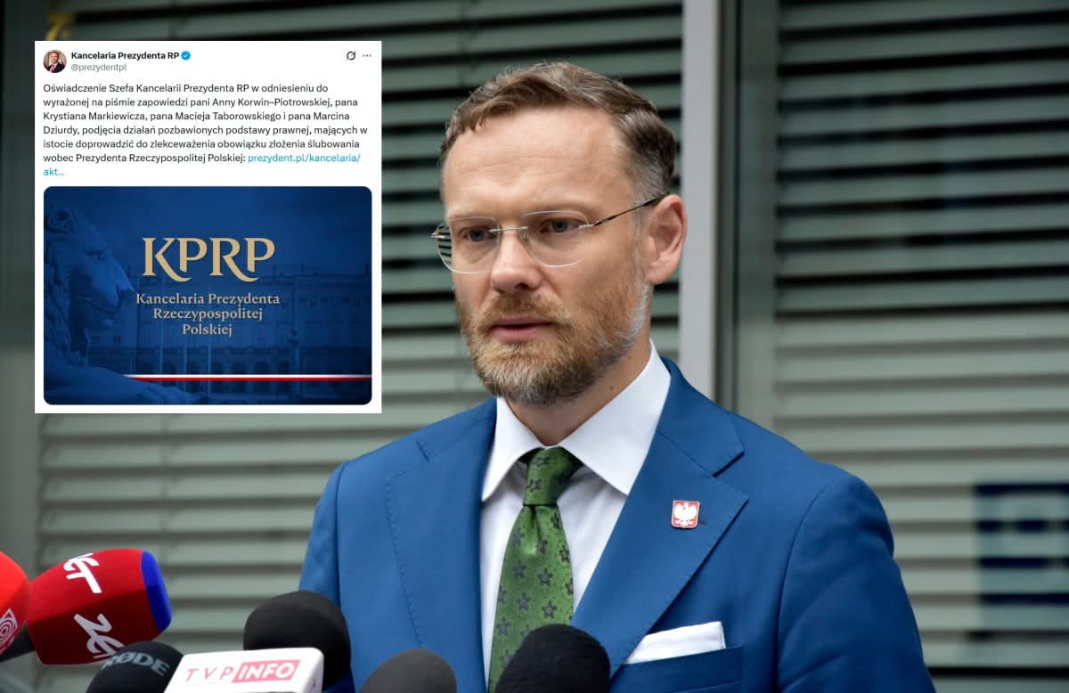 Działając w imieniu Prezydenta Rzeczypospolitej Polskiej, w odniesieniu do wyrażonej na piśmie zapowiedzi pani Anny Korwin–Piotrowskiej, pana Krystiana Markiewicza, pana Macieja Taborowskiego i pana Marcina Dziurdy podjęcia działań pozbawionych podstawy prawnej, mających w istocie doprowadzić do zlekceważenia obowiązku złożenia ślubowania wobec Prezydenta Rzeczypospolitej Polskiej, przedstawiam następujące stanowisko.